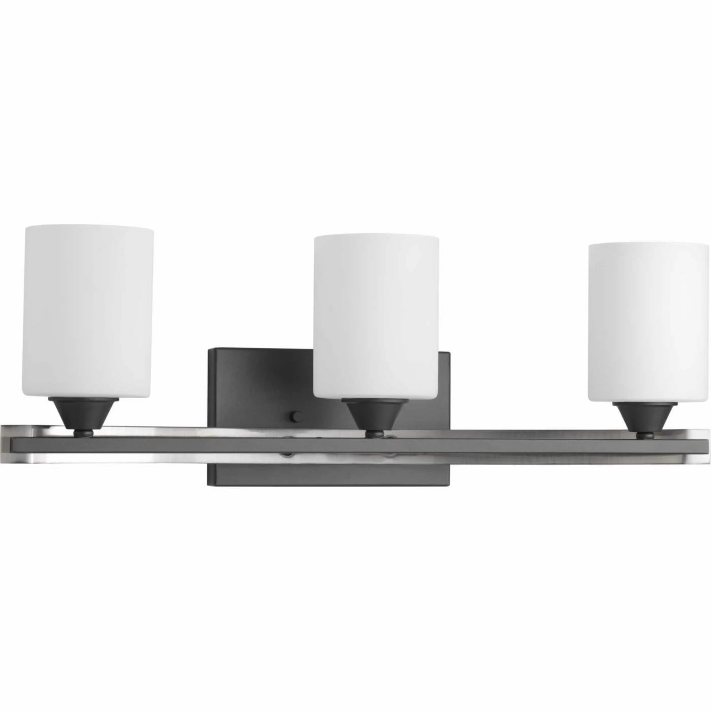 Your getting ready area will finally have sufficient lighting with the Progress Lighting Dart 3 Light Bathroom Vanity Light. The steel square back holds a horizontal bar with three lights with cylinder shades. The frame features a black and silver finish with a white shade. This light fixture requires three 100-watt incandescent bulbs that are not included.