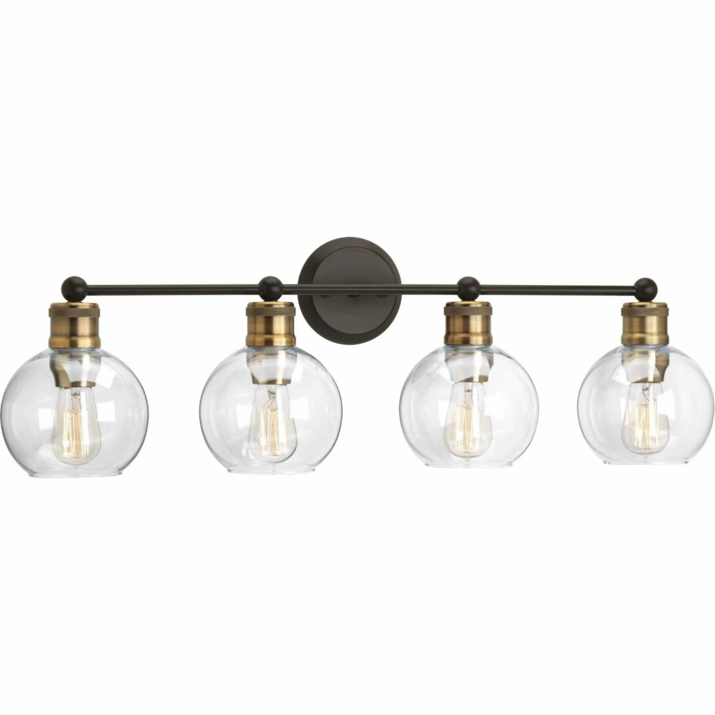 Fill your bathroom will abundant light from the Progress Lighting Hansford 4 Light Bathroom Vanity Light. This four-light bathroom vanity light is constructed with a steel frame, in your choice of available finish, and clear glass shades with exposed bulbs. Pair this bathroom vanity light with other pieces from the Hansford Collection. This light fixture requires four 100-watt incandescent bulbs that are not included.