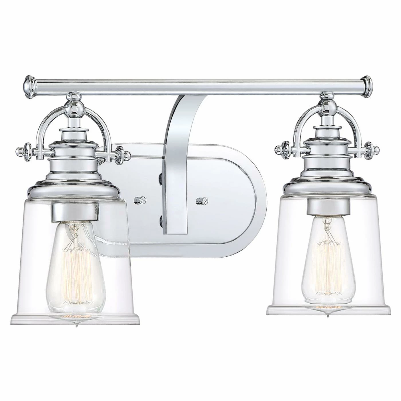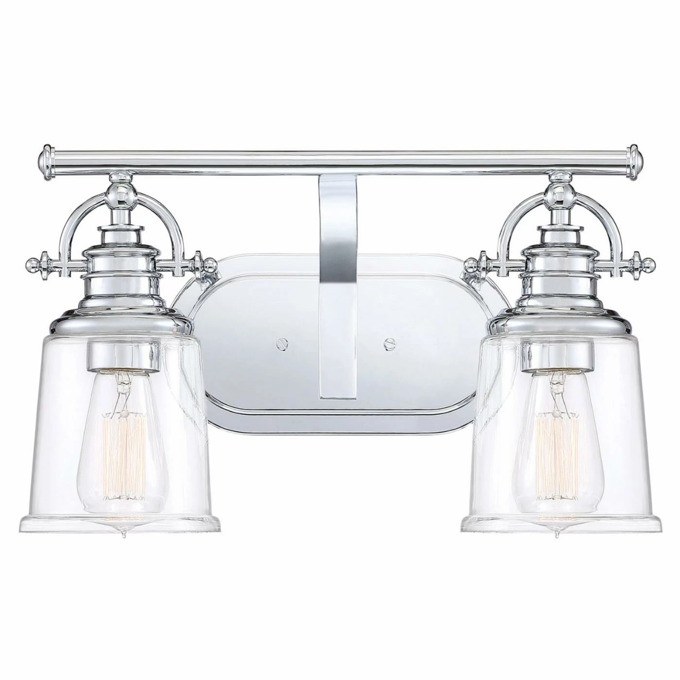 Update your small bathroom vanity space with the Quoizel Grant 2 Light Bathroom Vanity Light. This bathroom vanity light has just two lights but their clear glass shades allow for plenty of illumination. This vanity light has a sturdy steel construction. A polished chrome finish adds contemporary style.