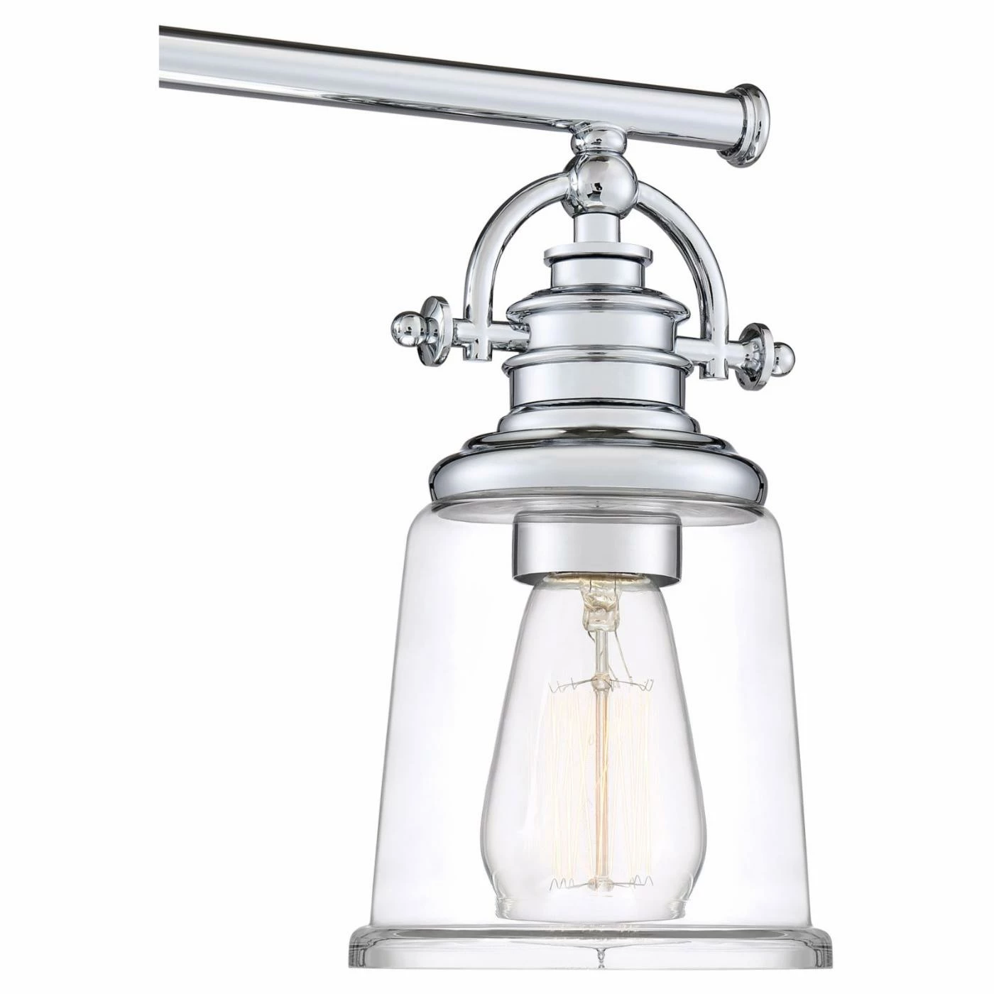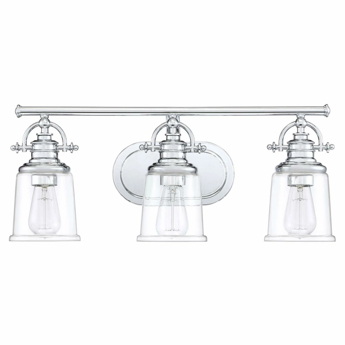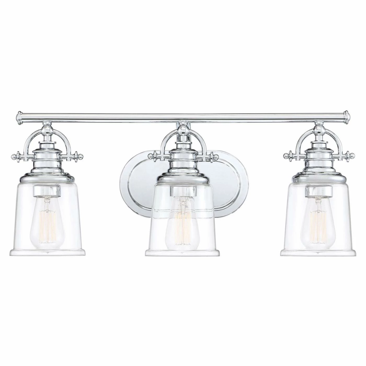 TheΒ Quoizel Grant 3 Light Bathroom Vanity Light is a timeless lighting option for your bathroom. This bathroom vanity light includes three lights under clear glass shades for sufficient illumination. The sturdy steel construction has a sophisticated polished chrome finish for a modern look.