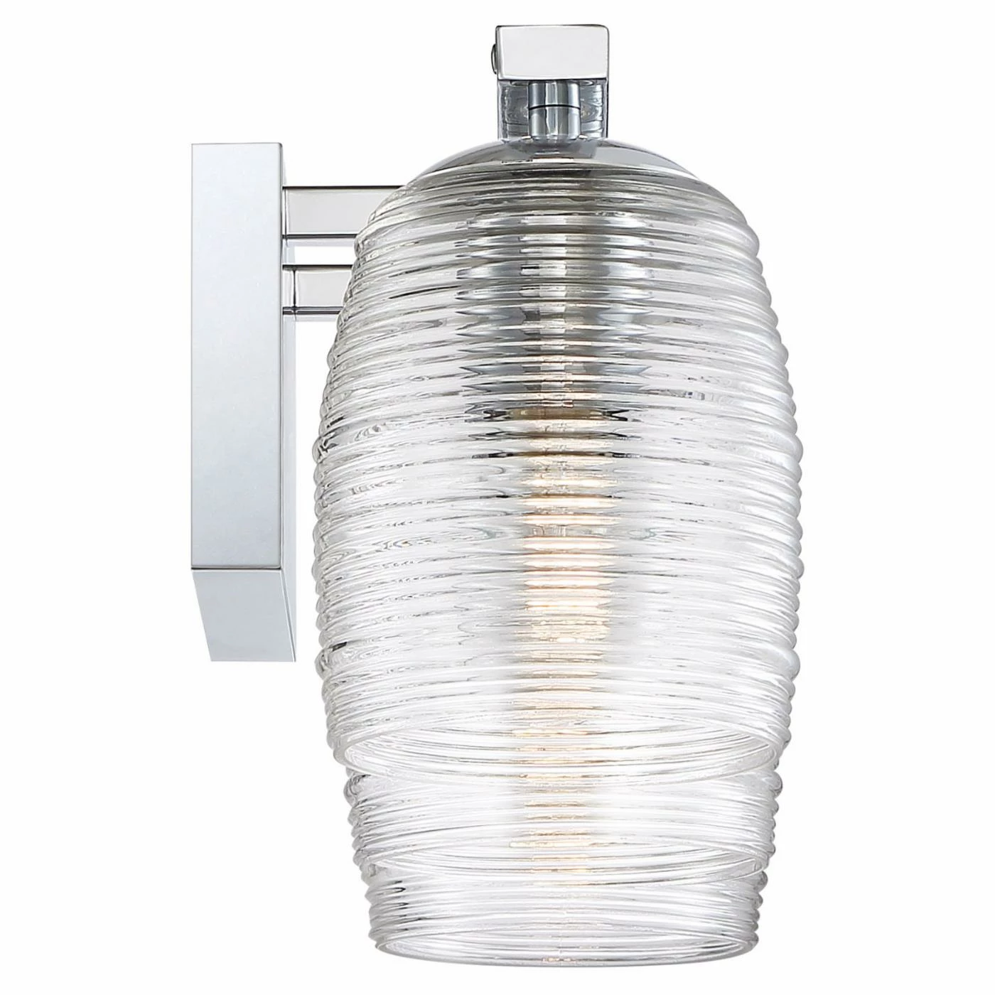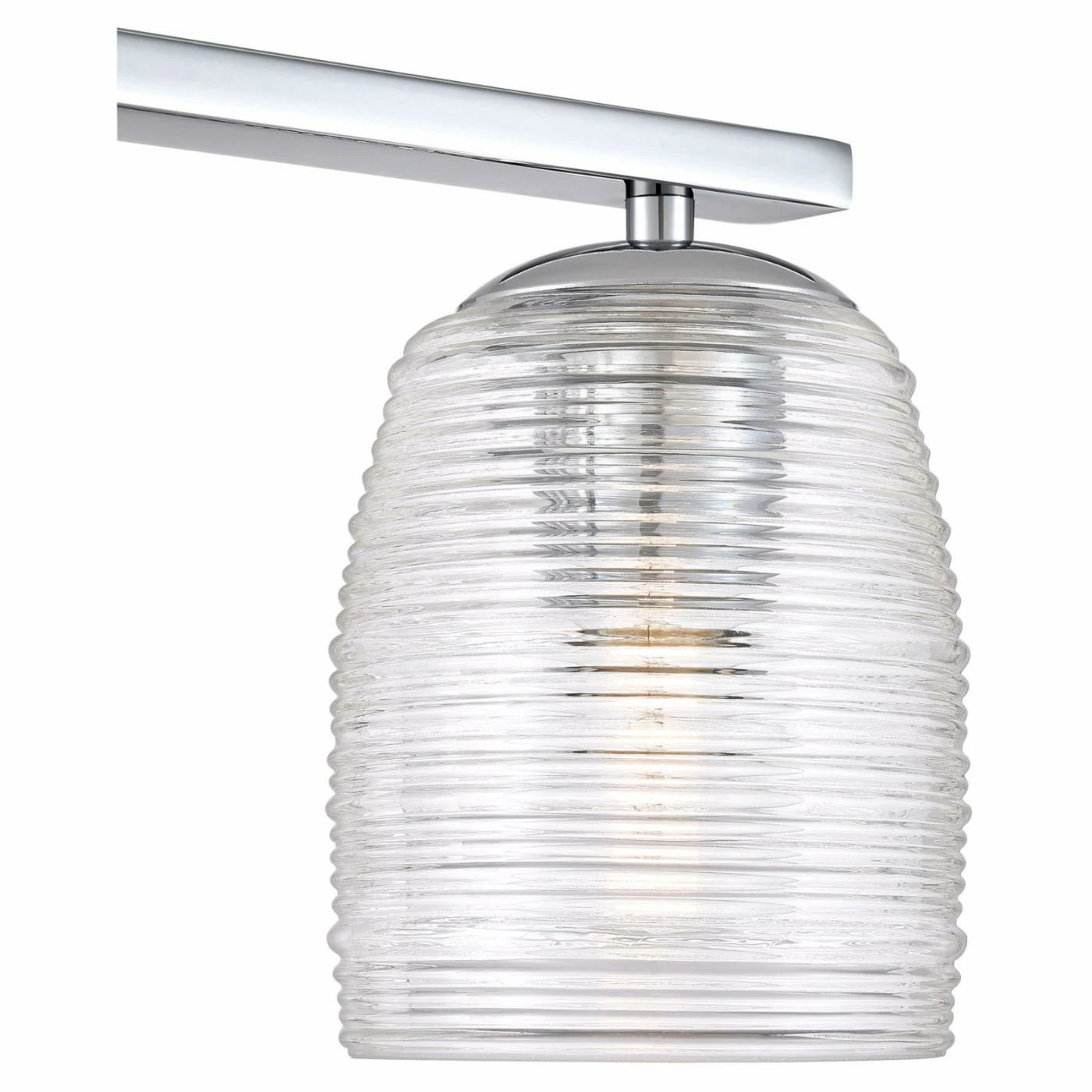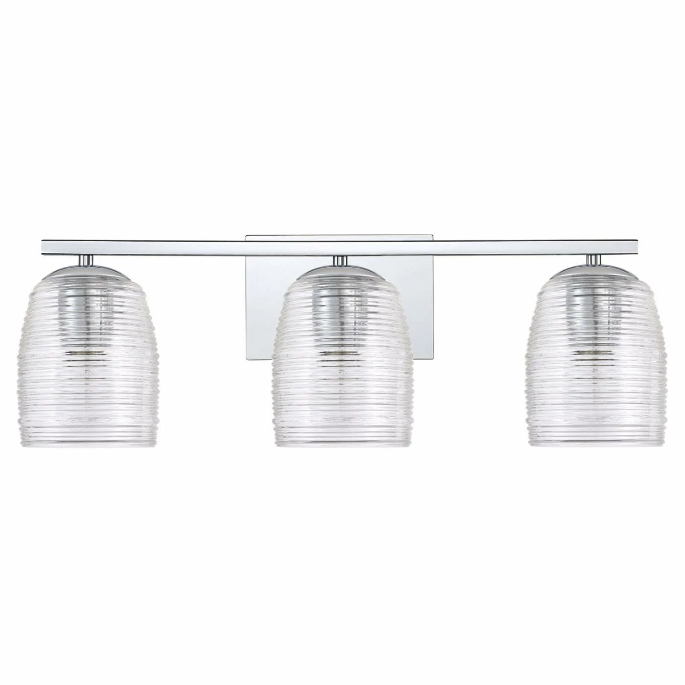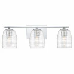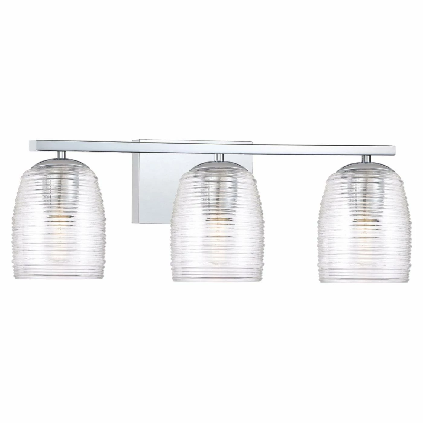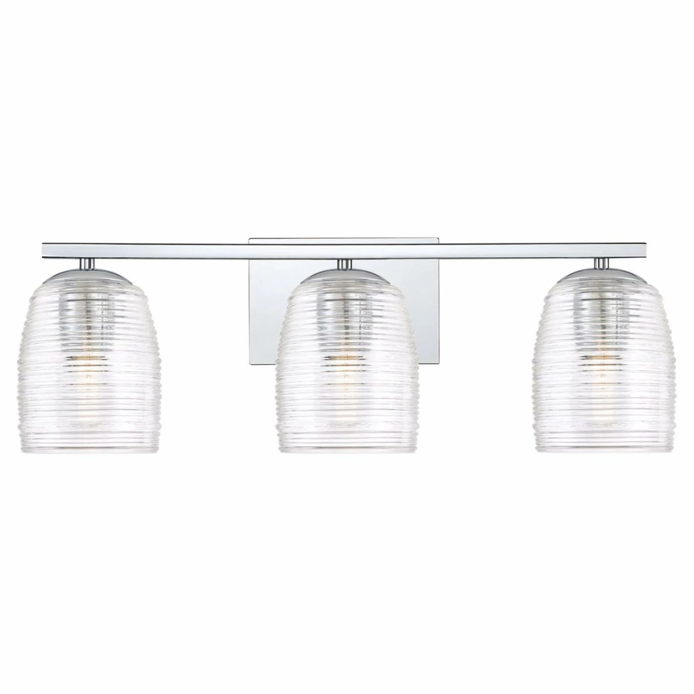TheΒ Quoizel Realm 3 Light Bathroom Vanity Light is a contemporary lighting choice with timeless appeal. This bathroom vanity light has three lights in ridged glass shades for sufficient illumination. The sturdy steel frame has a polished chrome finish for a sleek modern look.