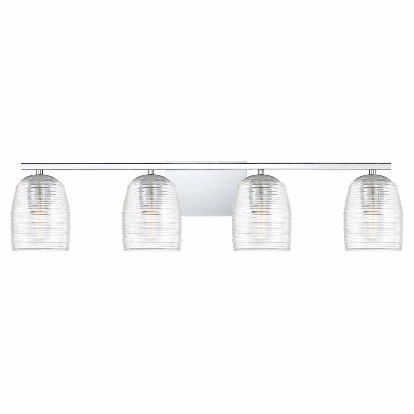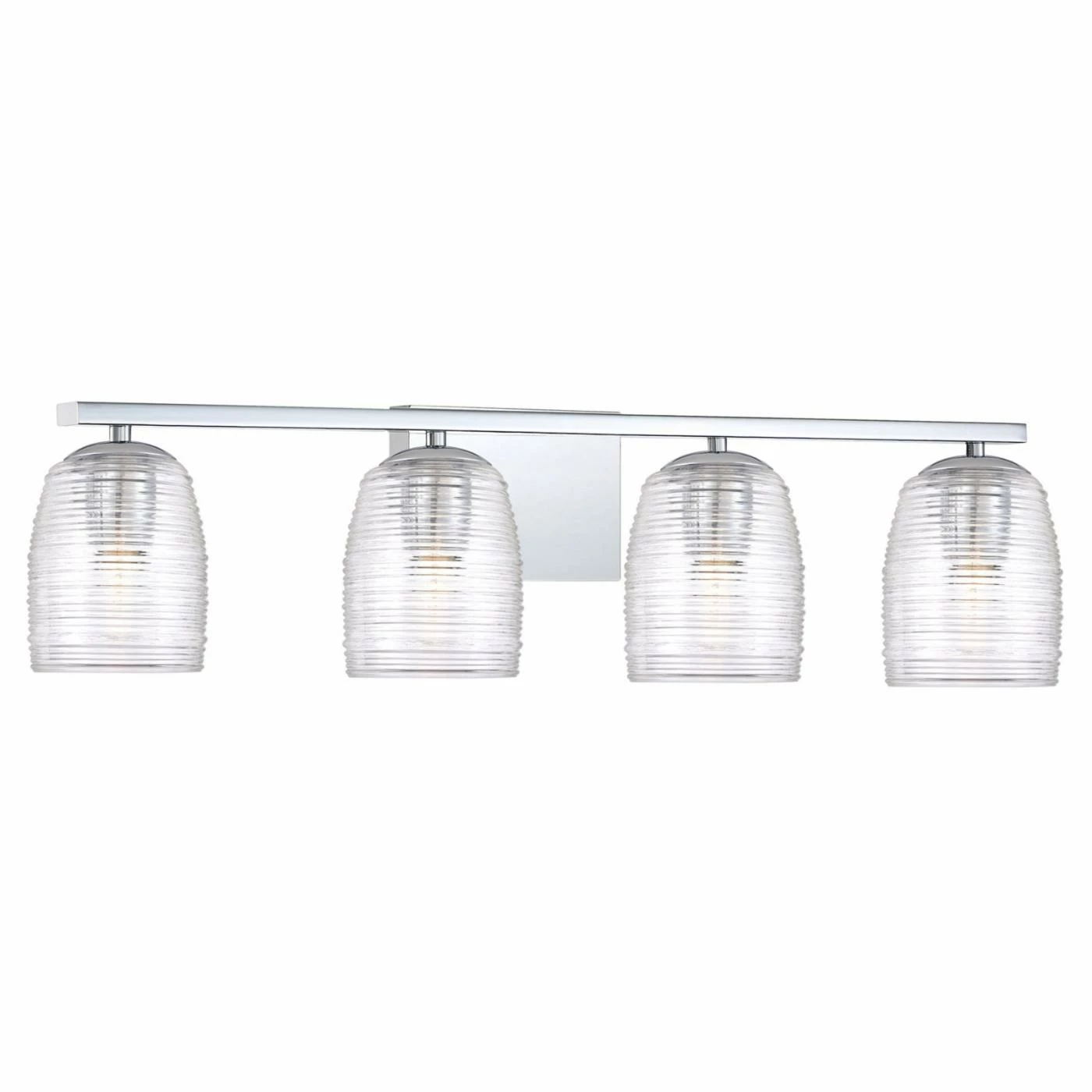 Effortlessly illuminate your vanity with theΒ Quoizel Realm 4 Light Bathroom Vanity Light. This bathroom vanity light has four lights in ridged glass shades for a vibrant glow. Its sleek polished chrome finish creates a contemporary look that complements the sturdy steel frame.