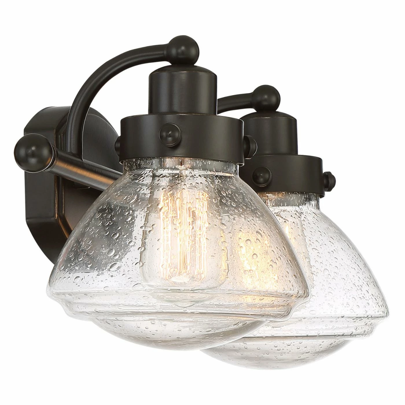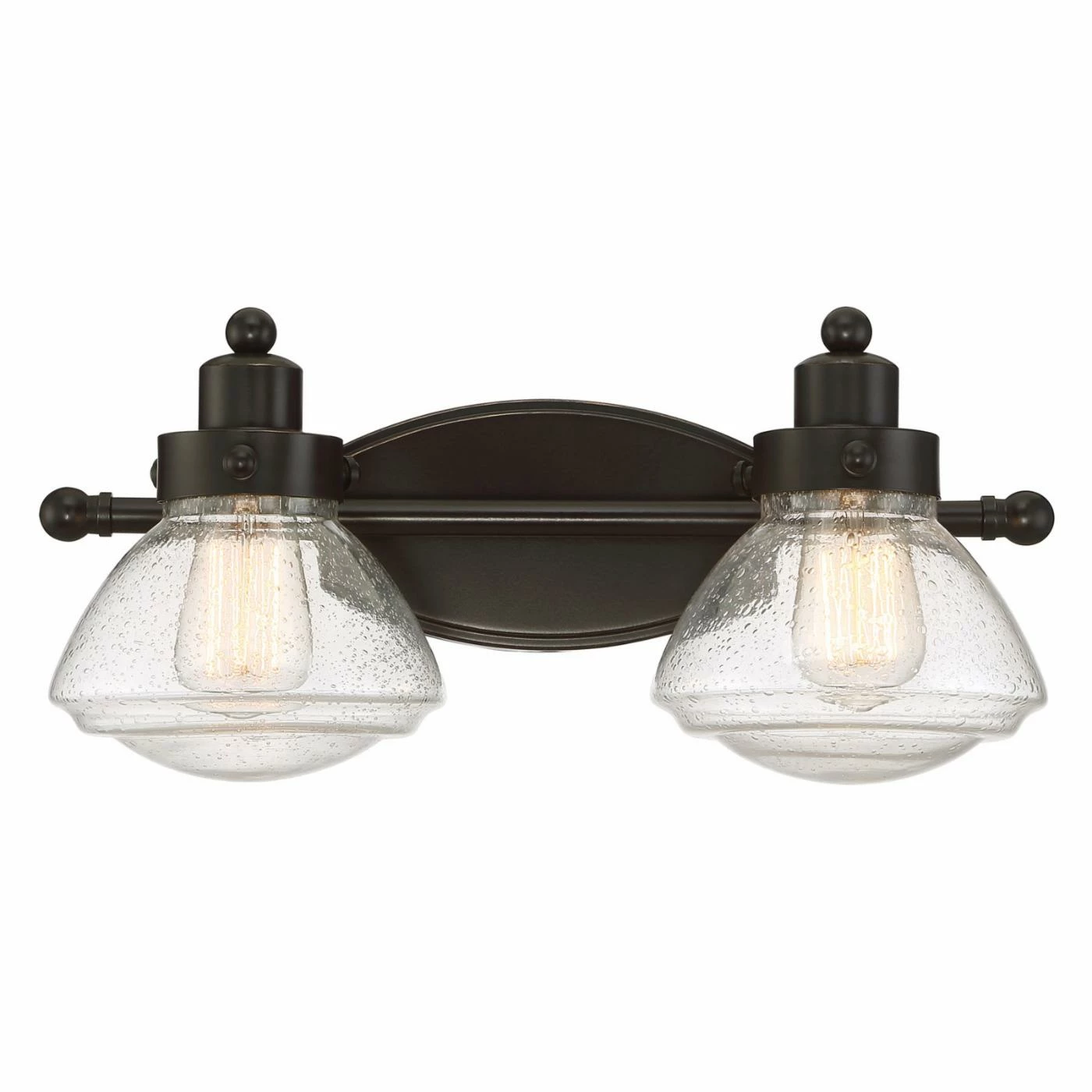 Enhance the visual appeal of your bathroom with the vintage chic look of the Quoizel Scholar SCH8602PN 2 Light Bathroom Vanity Light. This traditional fixture draws inspiration from schoolhouse lights from days gone by and features a Palladian Bronze finish for an aged look. Designed to hold vintage-style bulbs, the fixture has two down lights surrounded by clear seeded glass shades.