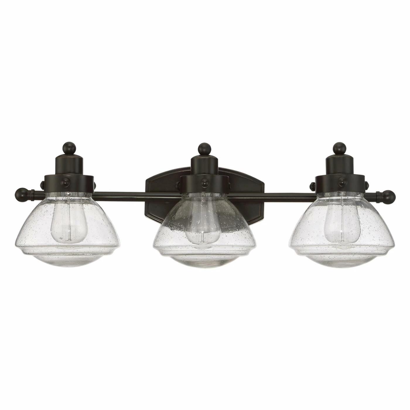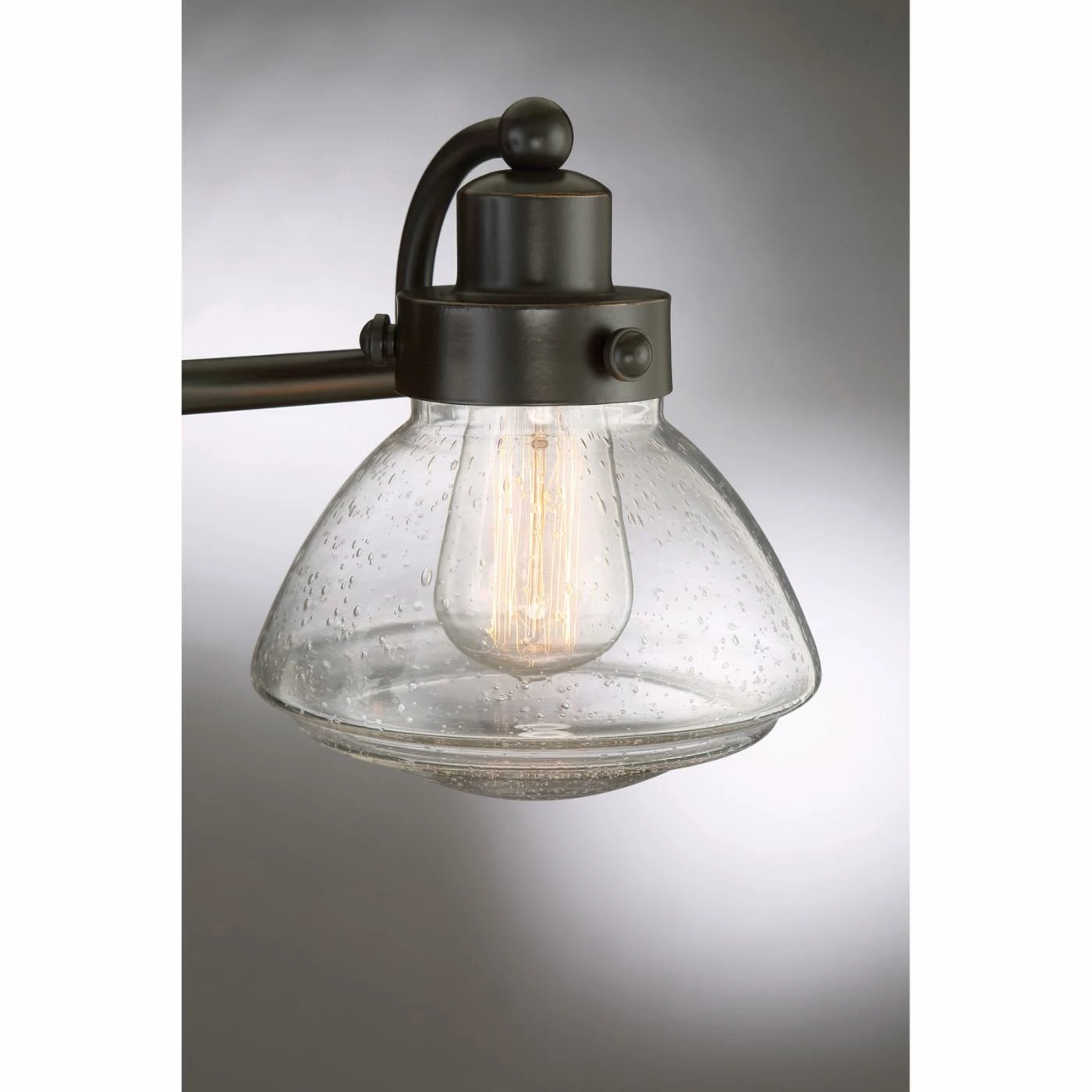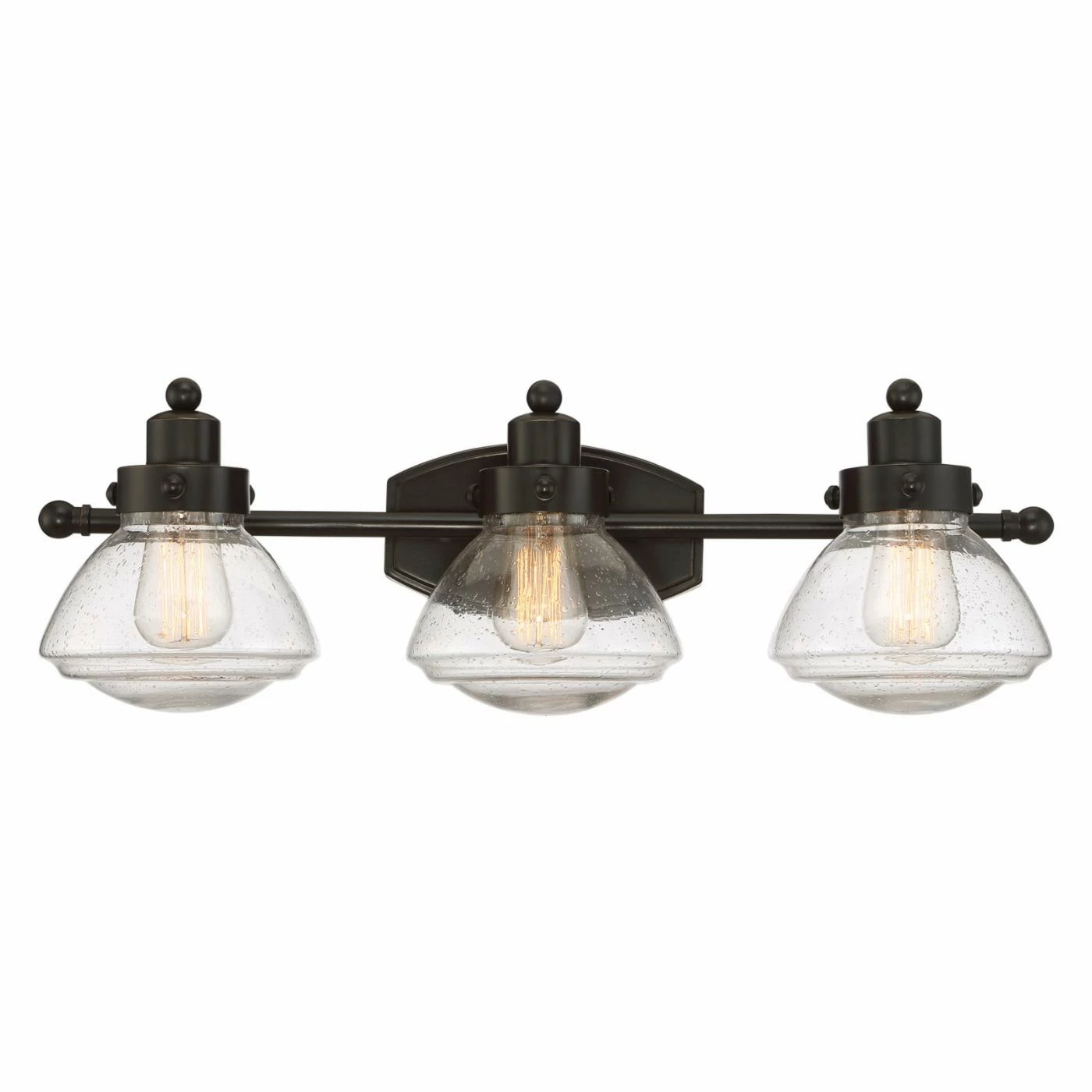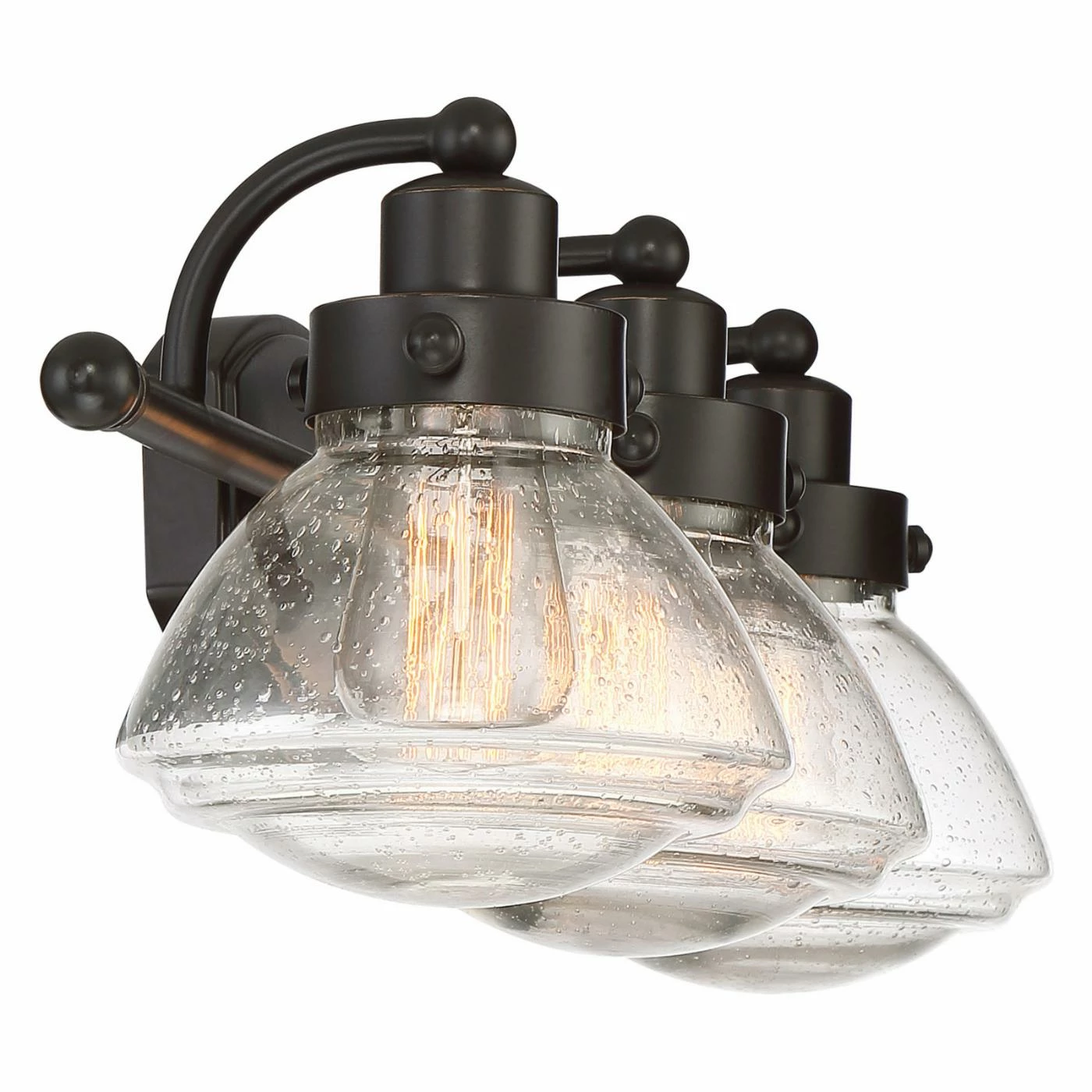 The Quoizel Scholar SCH8603PN 3 Light Bathroom Vanity Light is inspired by vintage schoolhouse lighting and instantly adds interest to the look of traditional bathrooms. Its clear seeded glass shades are meant to enclose vintage style bulbs and provide a full view of the down lights. Capped with ball accents, the mounting arms are finished in Palladian Bronze, and the curved backplate shows off the same aged brown color.