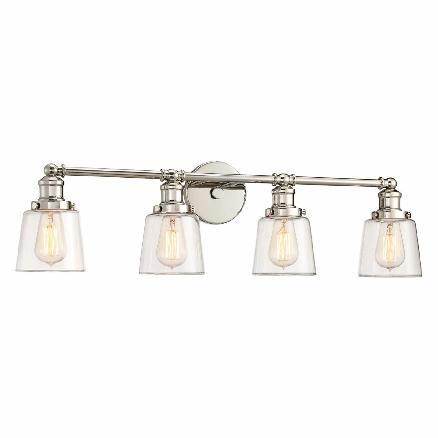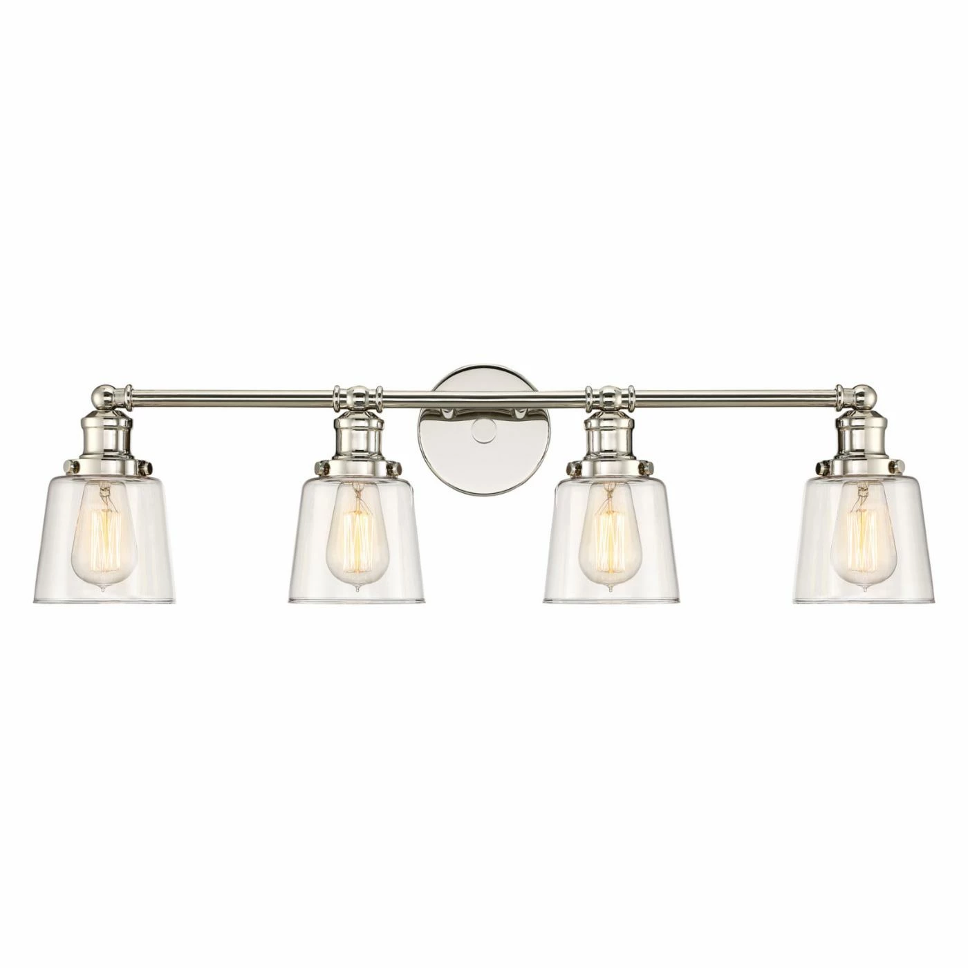 Add a warm glow to your sink area with the Quoizel Union UNI8604PK 4 Light Bathroom Vanity Light. The champagne-tinted, clear glass shades that surround the four down lights give the illumination produced by the fixture a pleasing quality. Finished with polished chrome, the round backplate and ball-accented arm of the vanity light have a sleek, simple look inspired by industrial design. The fixture is meant to hold vintage-style bulbs.