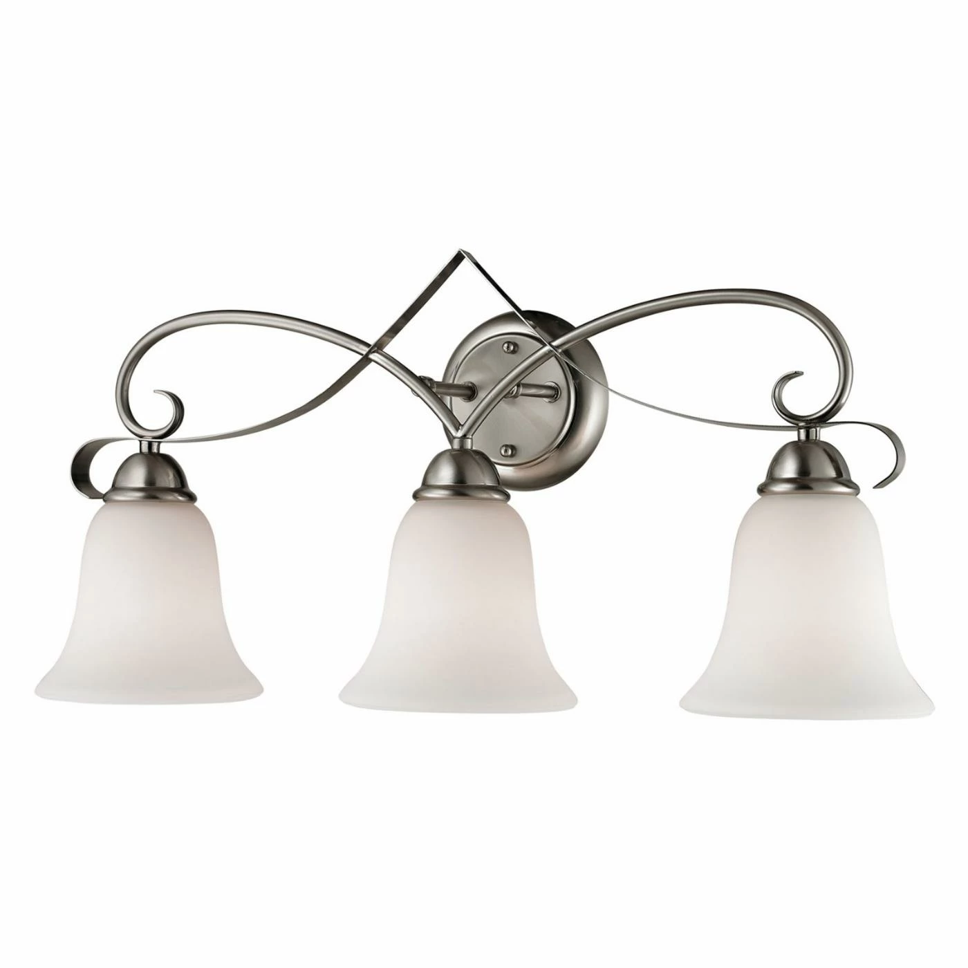 Pairing an elegant scrollwork design with a sleek, brushed-nickel finish, the Thomas Lighting Brighton 1003BB Vanity Light with Optional LED Bulbs can work equally well in contemporary, transitional, and traditional bathrooms. The vanity light features three lamps with light-diffusing white-frosted glass trumpet shades.