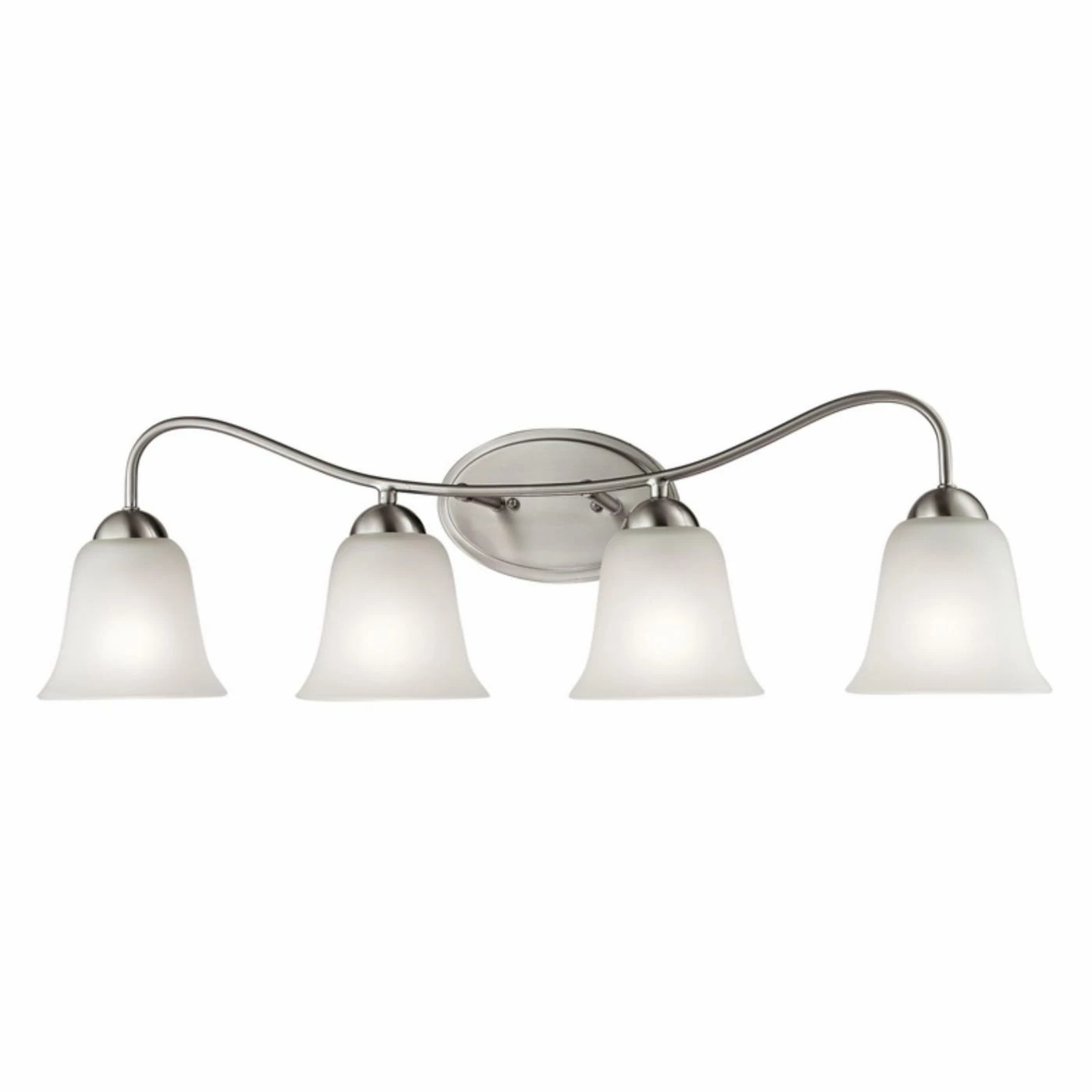 Showcasing graceful curves and a sleek brushed nickel finish, the Thomas Lighting Conway 1204BB Vanity Light with Optional LED Bulbs is a just-right match for transitional style. The steel vanity light supplies ample illumination without any glare, as its four lamps are diffused by frosted white glass.