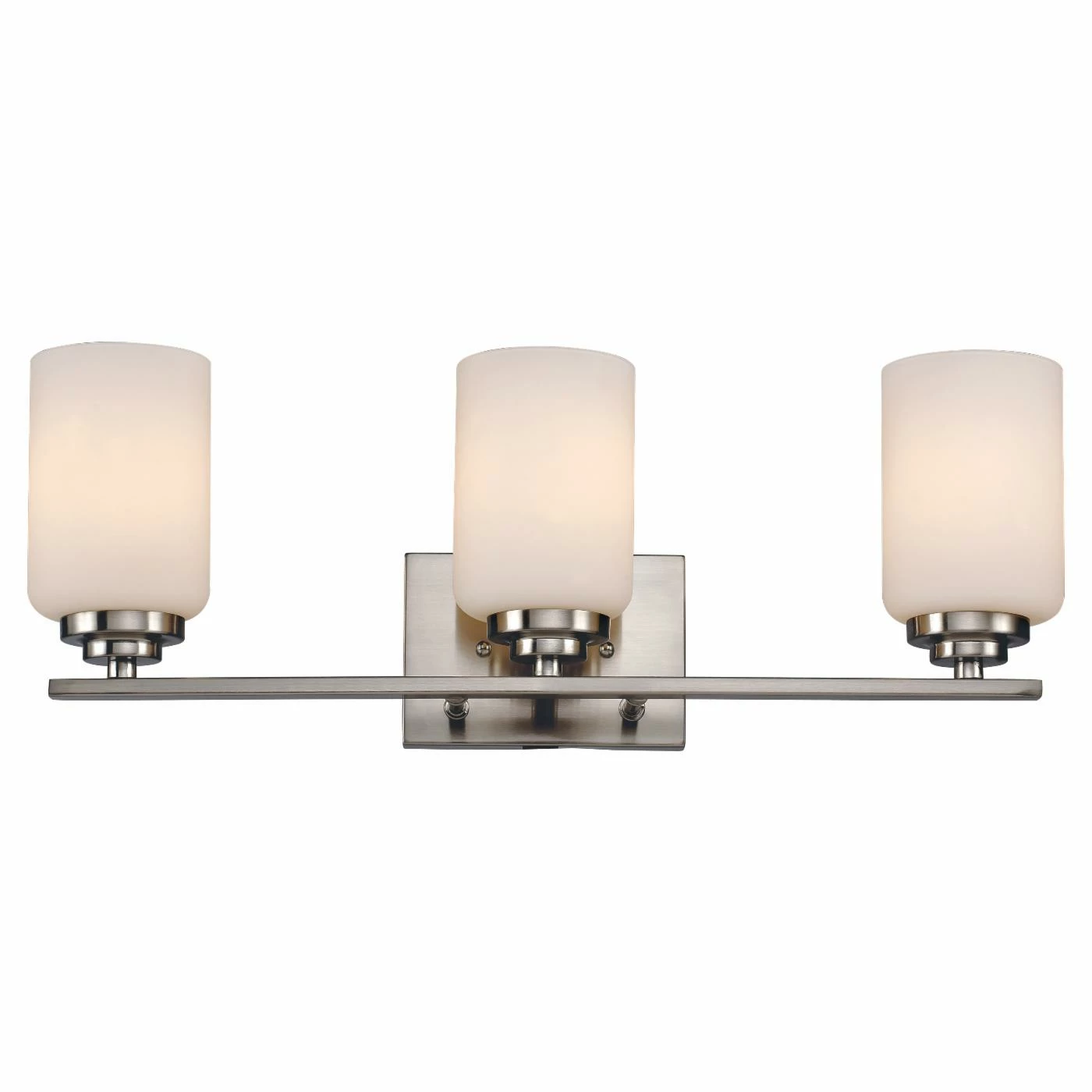 The Trans Globe Lighting 70523 Mod Space 3-Light Bathroom Vanity Light features three white frosted candle shades and steam punk piston hardware that add up to an industrial vibe. Available in select finish options you’ll love. This three-light fixture may be mounted with bulbs facing up or down. Bulbs not included.