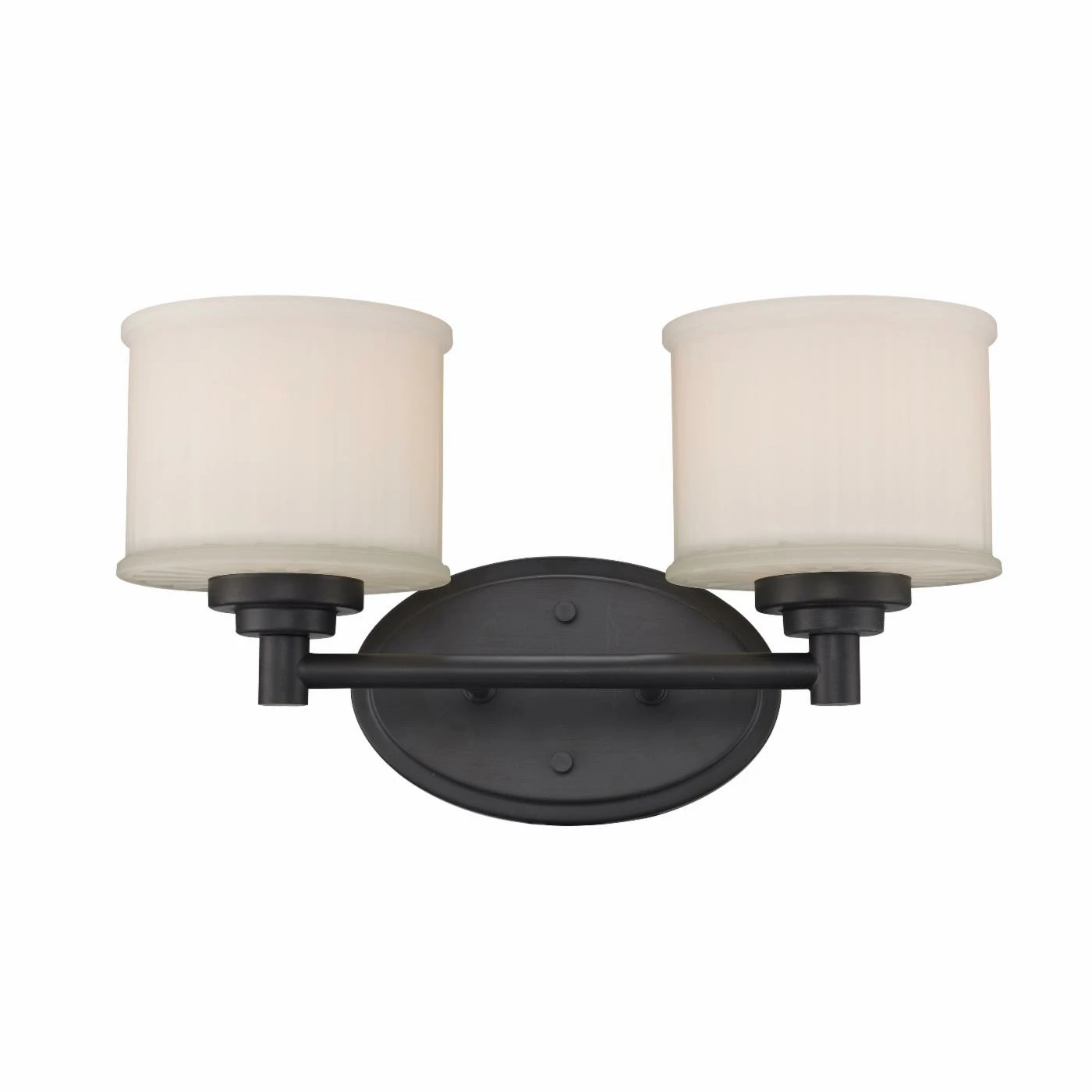 Two white frosted glass shades keep the Trans Globe Lighting Cahill 70722 Bathroom Vanity Light‘s 60-watt bulbs softly diffused to give you ideal conditions for getting ready. The metal framework is strong and simple, with clean, straight lines.
