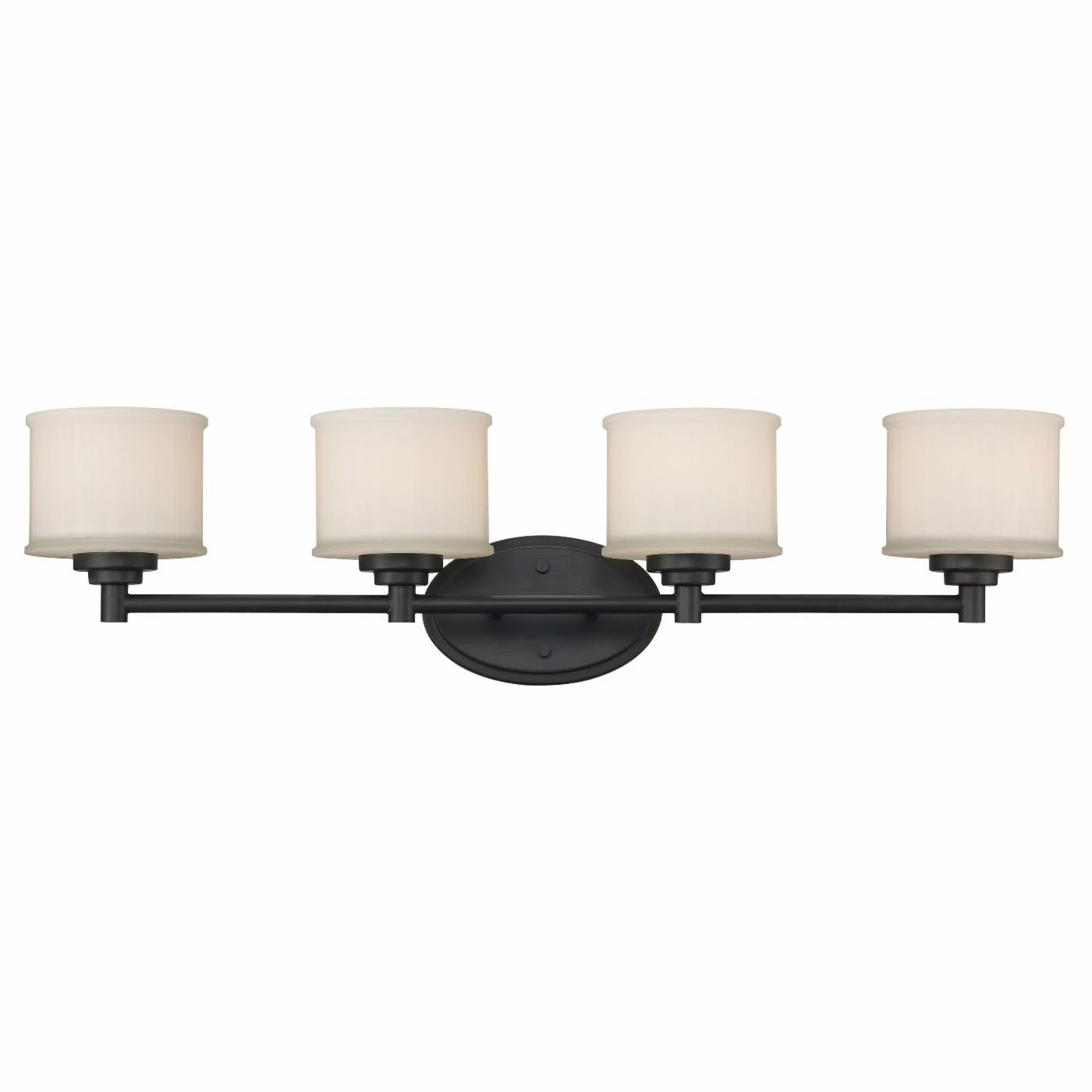 Four sleek white frosted glass shades gently diffuse the 60-watt incandescent bulbs of the Trans Globe Lighting Cahill 70724 Bathroom Vanity Light. The sleek metal framework boasts clean lines to complete the classic modern feel of this vanity light.