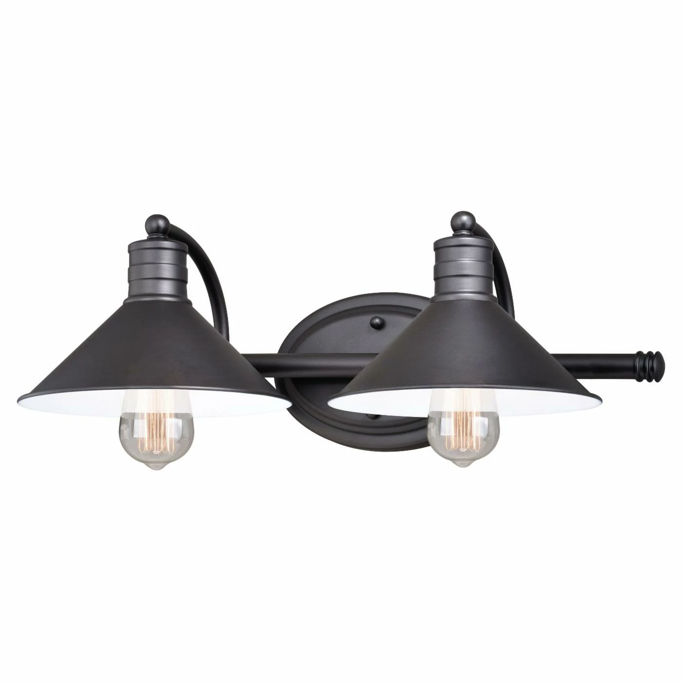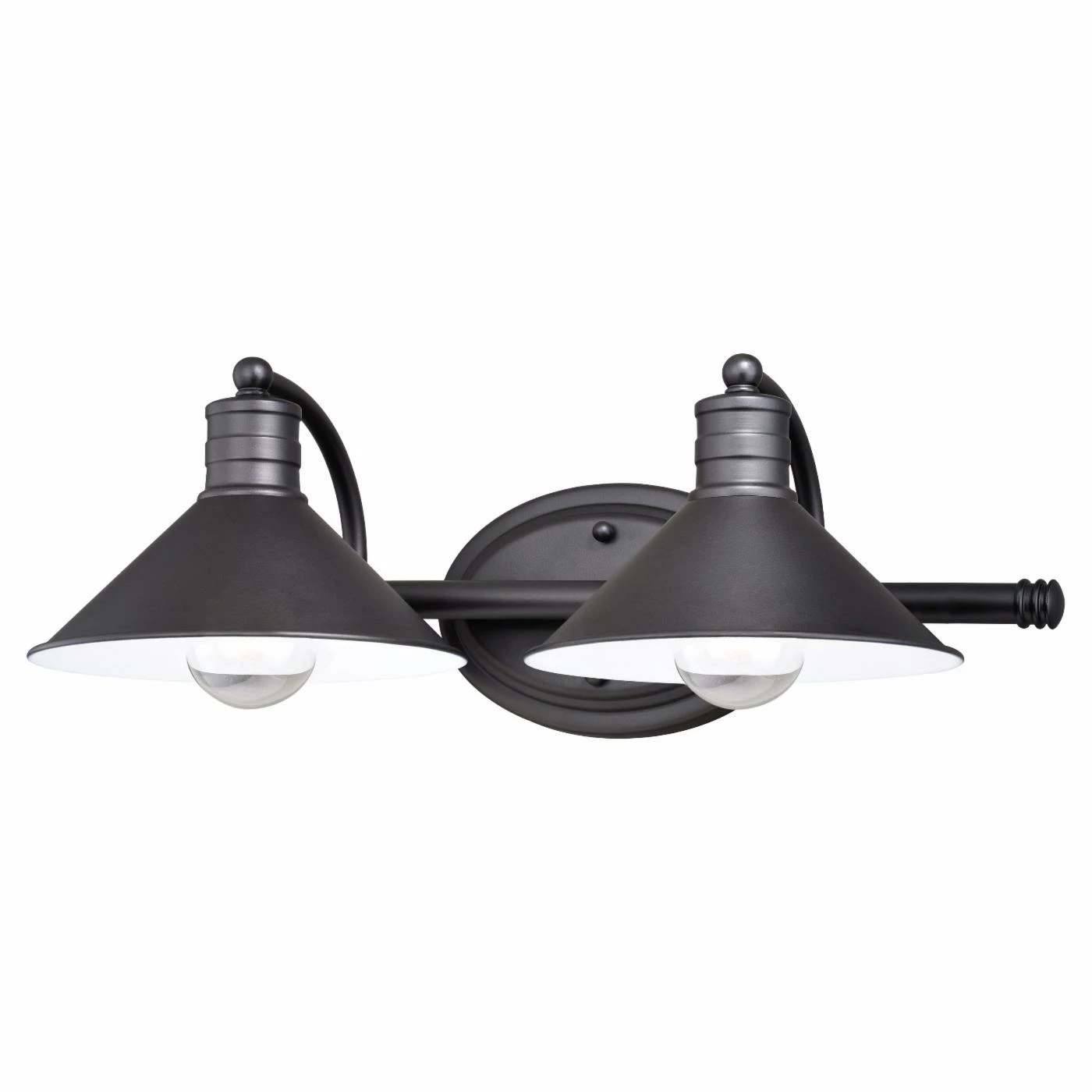The Vaxcel Akron 2 Light Bathroom Vanity Light boasts an exposed-bulb design and is an excellent source of down-cast lighting. The flared shades have matte white interiors, and the fixture flaunts a versatile oil rubbed bronze finish. This light is durably designed from 100% steel, and it uses standard medium-base bulbs.